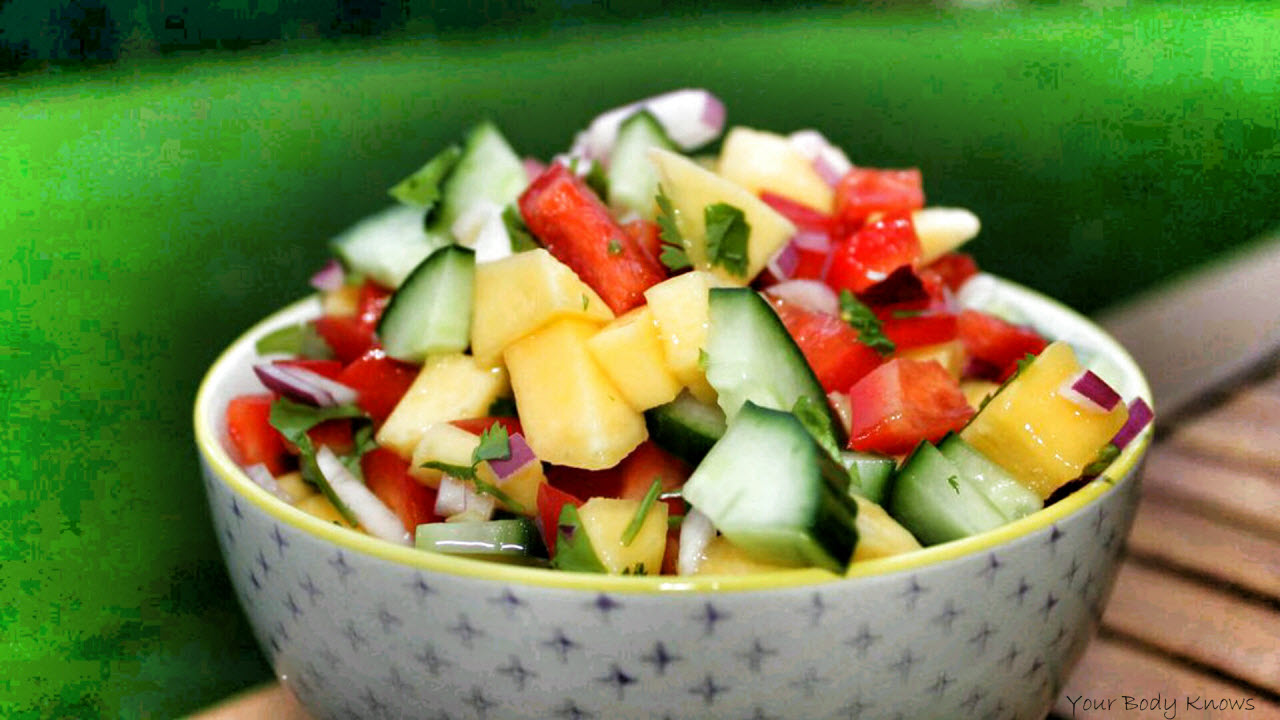 Peel the mango and cut it into small bite size cubes, along with the bell peppers and cucumber. Leave the middle of the cucumber out (eat it while you make the salad) – because the salad might get to watery if you use it. Chop the chili and the red onion into extra small bites.