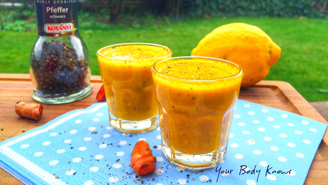 Juice the lemon and turmeric, add the olive oil and pour into two shot glasses. Sprinkle black pepper over the top and drink up!